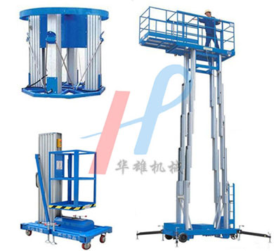 鋁合金升降機(jī)大致分為單桅升降機(jī)、雙桅升降機(jī)、三桅升降機(jī)和多桅升降機(jī)。鋁合金升降機(jī)采用高強(qiáng)度優(yōu)質(zhì)鋁合金材料,具有造型美觀、體積小、重量輕、運(yùn)轉(zhuǎn)靈活,推行方便,升降平穩(wěn)、安全可靠等優(yōu)點,它輕盈的外觀能在極小的空間內(nèi)發(fā)揮最高的舉升能力。廣泛用于工廠、賓館、餐廳、車站、影劇院、展覽館等場所,是保養(yǎng)機(jī)具、油漆裝修、調(diào)換燈具、電器、清潔保養(yǎng)等用途的最佳安全伴侶。